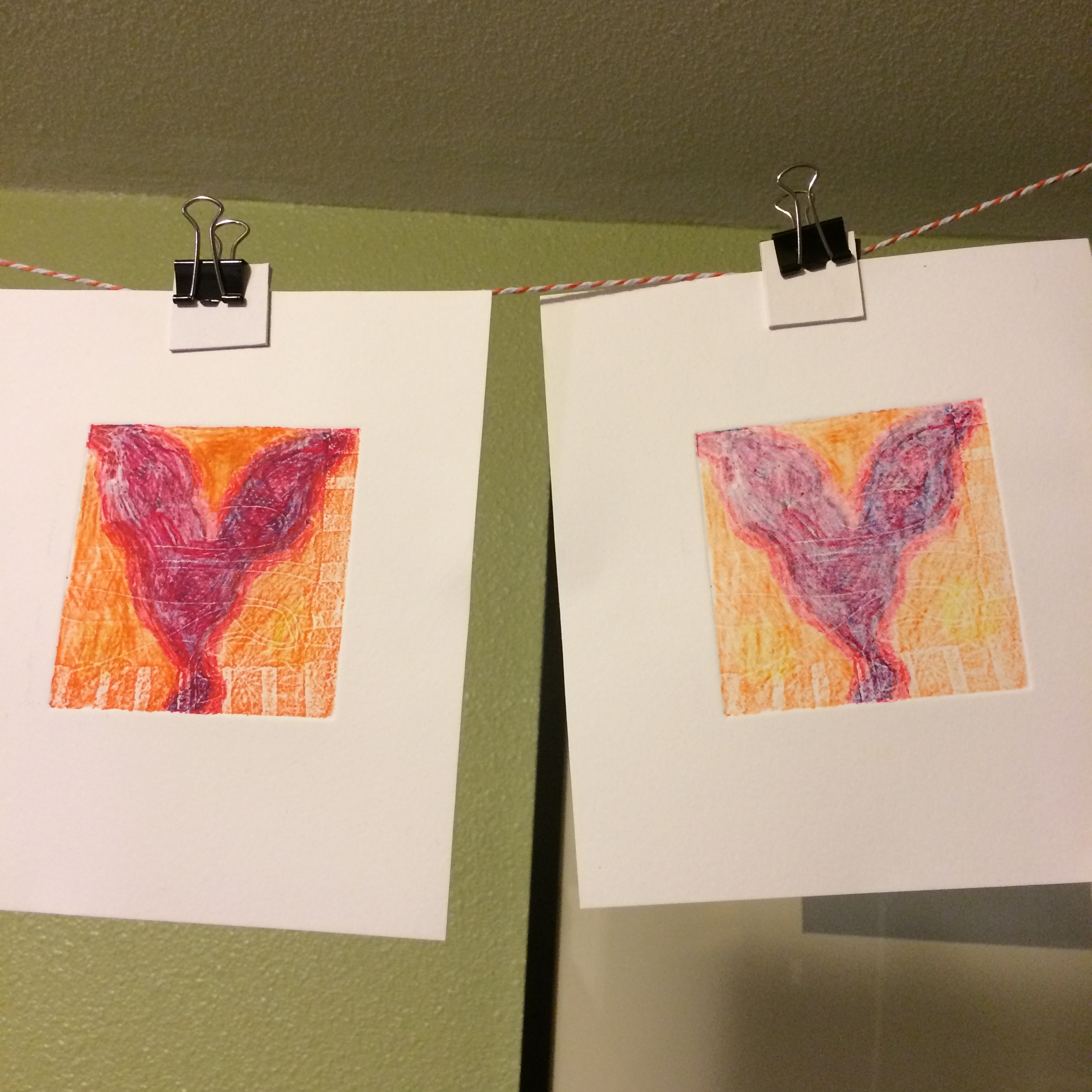 - I’ve color coded two sheets of transparent vellum and layered them on top of each other. This helps me to plan the shifts in tone, and also gives me an approximation of where the two colors will combine to make a third color.