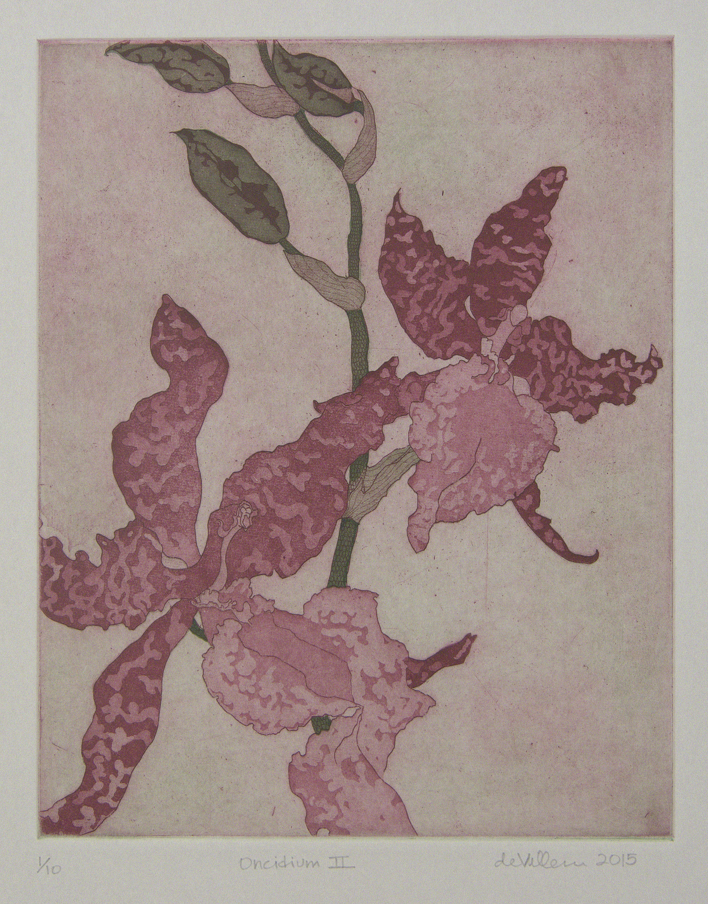 - This collagraph print from 2012 is the first in the orchid series. This oncidium orchid was the first of many to die for my printmaking.