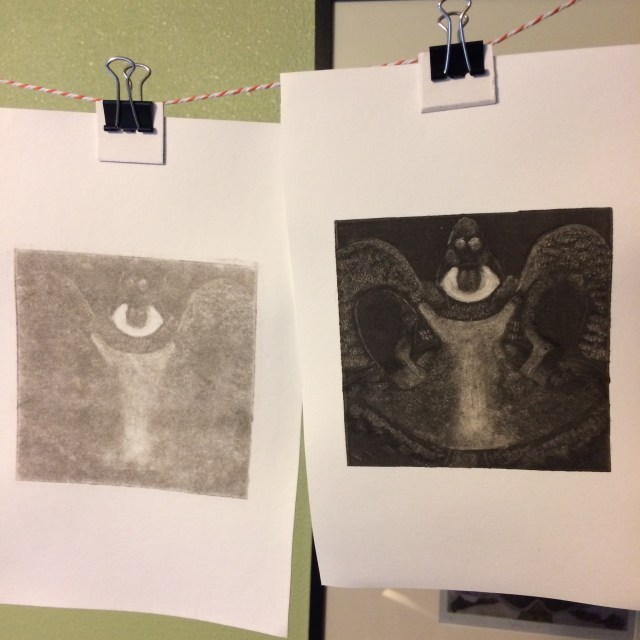 Monotypes no. 18, 19, 20 and ghosts with relief printing, hung up to dry. It seems simple enough to roll ink onto a relief block, but learning exactly how much ink should be applied takes a lot of trial and error. Once the block is inked, is it better to hand-transfer the ink to paper […]