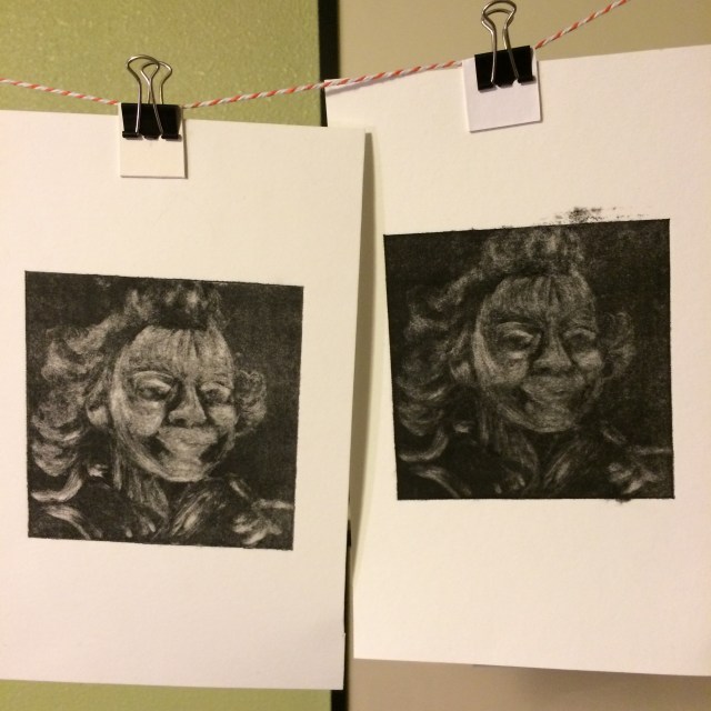 Monotype #14: Charbonnel water based etching ink on Stonehenge paper. This print makes me realize what a wonderful medium monotype is for depicting hair. Faces…not so much.